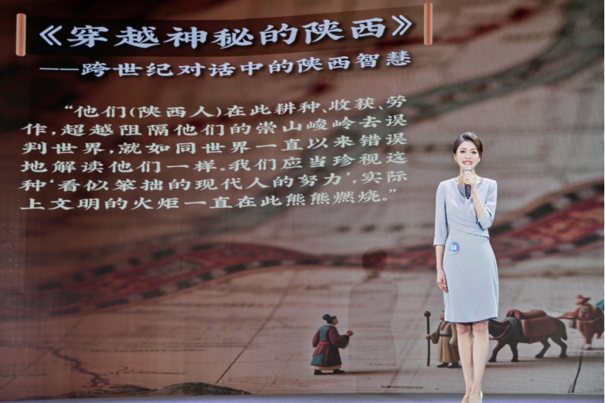 决赛现场,张卓以《穿越神秘的陕西》——跨世纪对话中的陕西智慧为讲述书目,从陕西耕读传家的传统切入,引发了大家对于在科技时代重塑知识价值的思考。她还借助尼克尔斯的故事,呼吁打破隔阂,加强中外交流与理解。展现出深厚的文化底蕴和深刻的思想内涵。张卓精彩的讲述引发现场观众的强烈共鸣,赢得了阵阵掌声。